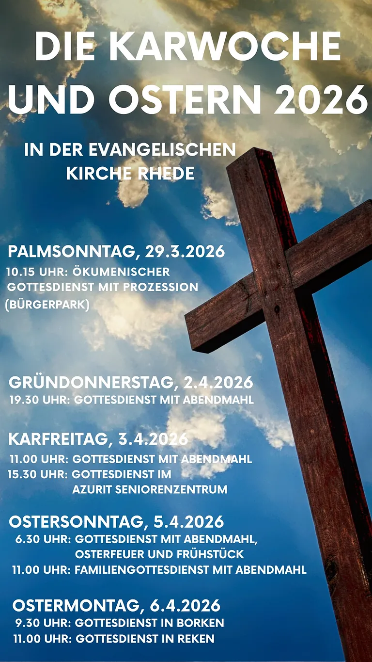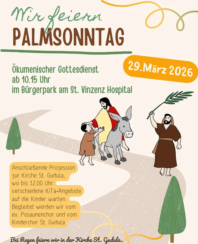 29.03.2026 | 10.15 Uhr - Palmarum ökumenischer Gottesdienst im Bürgerpark und anschließende Prozession zur Gudulakirche, dort wird ein kreatives Programm für Kinder an unterschiedlichen Stationen angeboten Gestaltung: Gottesdienstteam, Pfarrer Thorsten Schmölzing, Pfarrer Dr. Markus Totzeck Musik: Posaunenchor Bei Regen feiern wir den Gottesdienst in der Kirche St. Gudula |