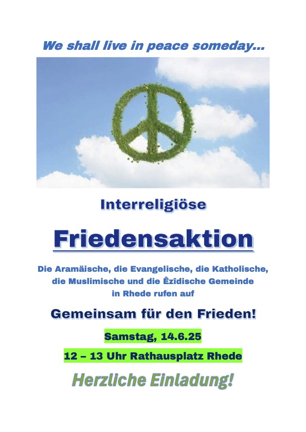 Das Friedensgebet versteht sich trotzdem als ein offenes Angebot an alle, die ihrem Wunsch und ihrer Sehnsucht nach Frieden Ausdruck verleihen möchten - ganz unabhängig von ihrem Glauben oder ihrer Religionszugehörigkeit. Die interreligiöse Friedensaktion in diesem Sommer zum Stadtfest der Stadt Rhede hat uns sehr berührt und unseren Wunsch verstärkt, dass immer mehr Menschen in Rhede zusammen für den Frieden beten mögen – ruhig in ganz verschiedenen Sprachen oder auf eine andere Art als wir. Wir sind offen für jede oder jeden, die /der gern an einem Dienstag etwas sagen oder sich musikalisch einbringen möchte, einmalig oder regelmäßig. Gern einfach mitmachen!!! |